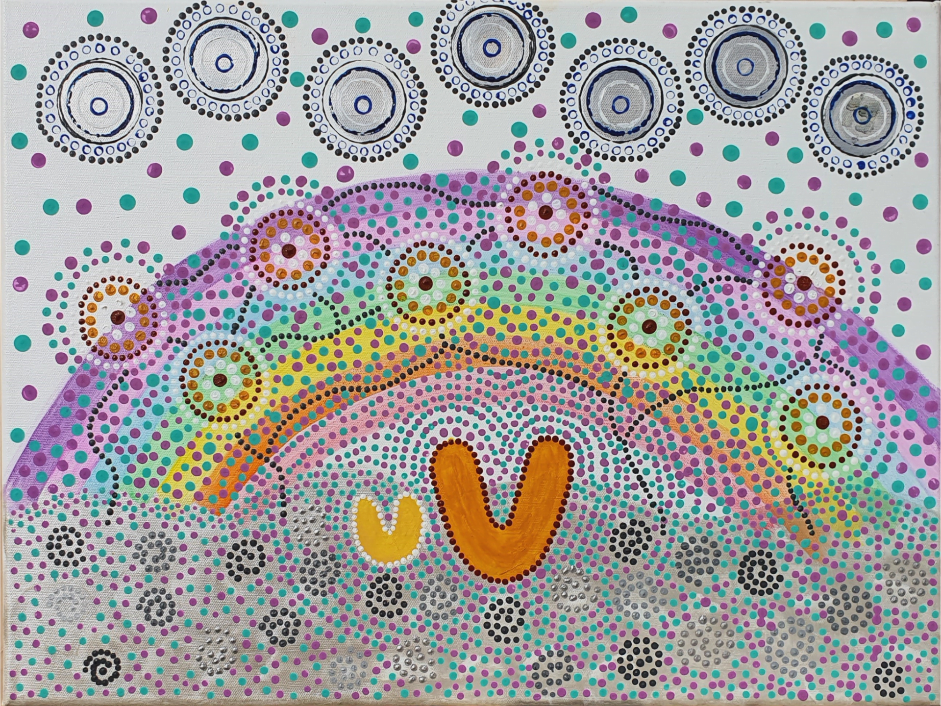 ForWhen artwork by Joy Makepeace. This is a story of a new mum (family) and baby and their journey together through pregnancy and new parenthood.  Sometimes when our babies are born we have to navigate some complex circumstances, including making connections with essential mental health services.  Often it can be a very turbulent time and it may feel overwhelming.  The rainbow in the background provides a vision of hope, inclusivity and understanding.  ForWhen ensures that you are surrounded and connected to services as necessary.  The seven stars in the sky will help guide you, look over you and support you while you navigate your way together to better mental health.
